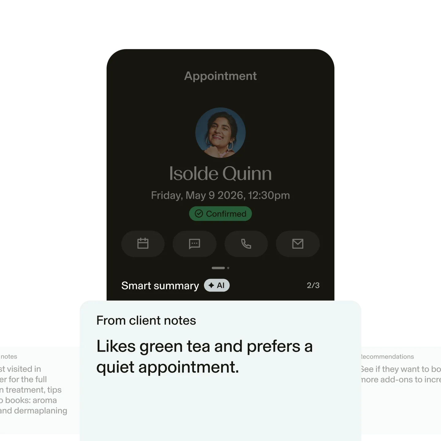 No more scrambling before appointments, trying to remember who bought what or if they got married yet. Get an instant summary of their history, preferences, and smart upsell opportunities, so every visit feels personal and drives more revenue.