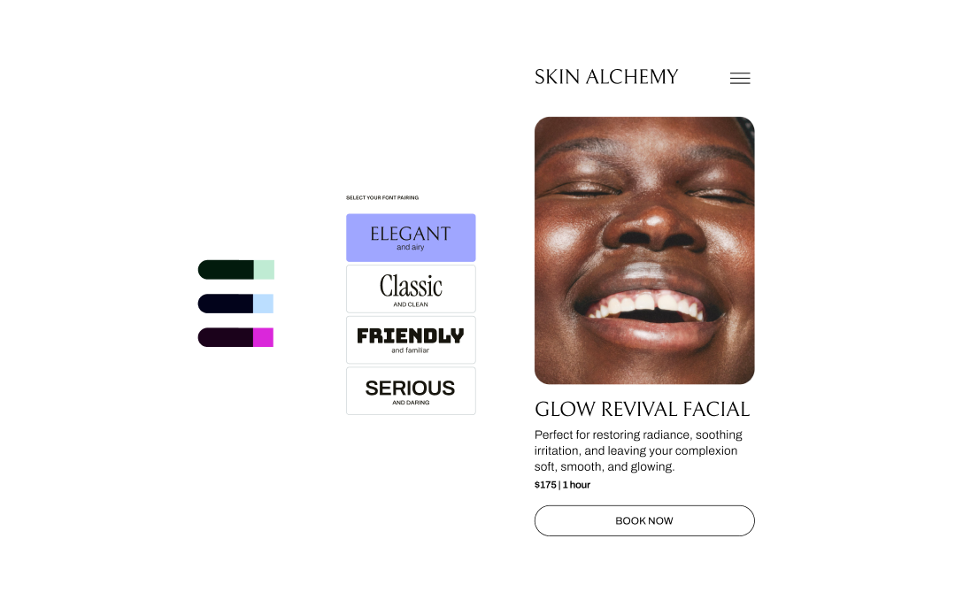 Build a professional booking site with just a few clicks using our designer templates and easy controls. Customize colors, add team member profiles, showcase your best work in a portfolio gallery, and more. No web experience needed.