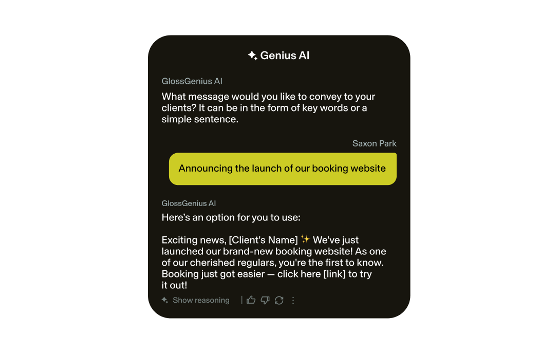Grow your clientele by connecting GlossGenius to Google, Instagram, Yelp & more. Plus, share your booking site with your contact list using Email & Text Marketing tools.