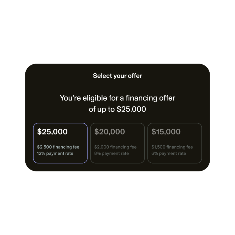 - Select your offer. Select the amount you need to fund your business. The accepted amount will determine your fee and repayment rate.