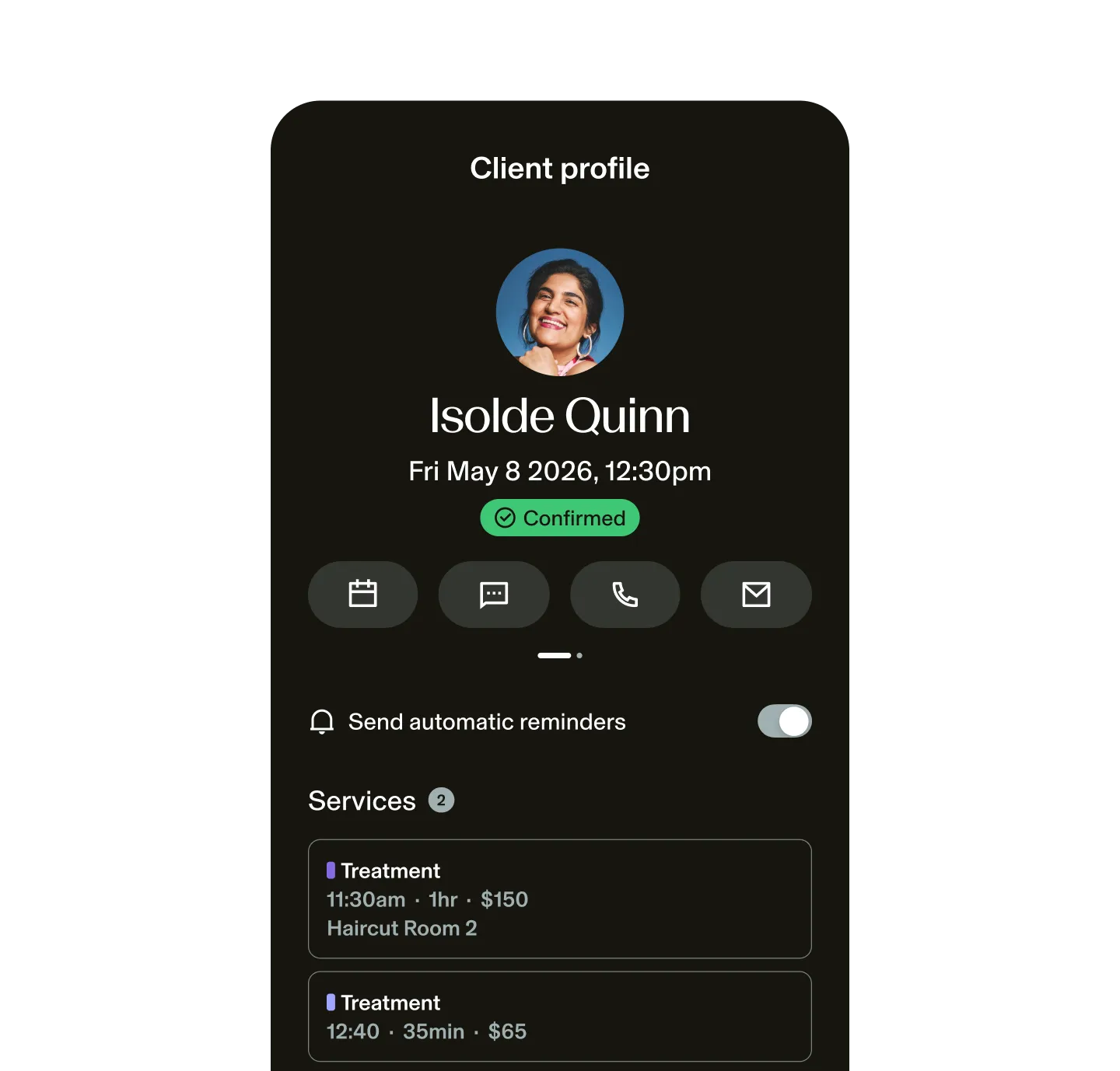 Send automatic appointment confirmations and Rebooking Reminders to drive recurring appointments. Stay on top of client communication with integrated Email & Text Marketing.
