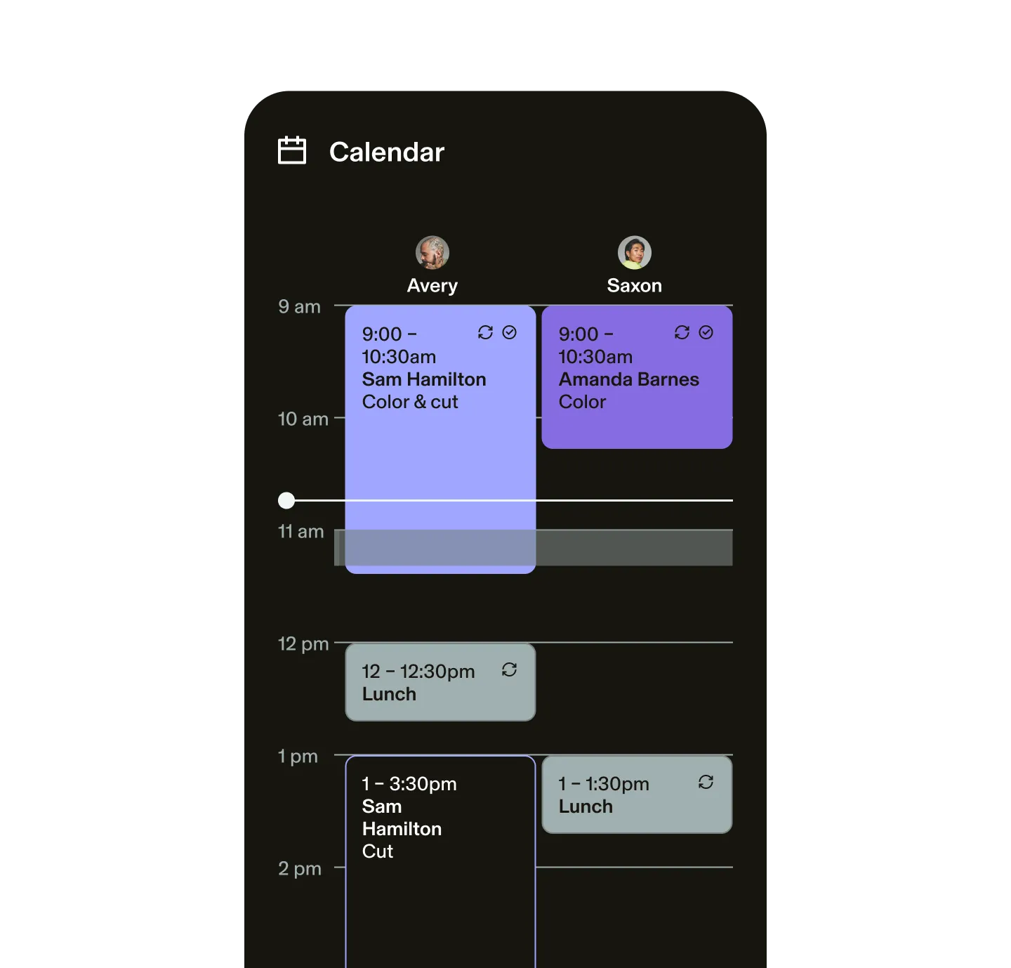 Get a birds-eye view of your business’s calendar, set your own custom work hours, vacation time, or repeating personal blocks.