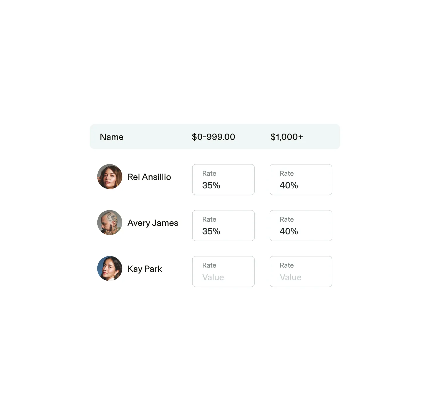 Align staff compensation with your business goals using flexible fixed-rate or tiered commissions, customized across individual employees, services, and products.
