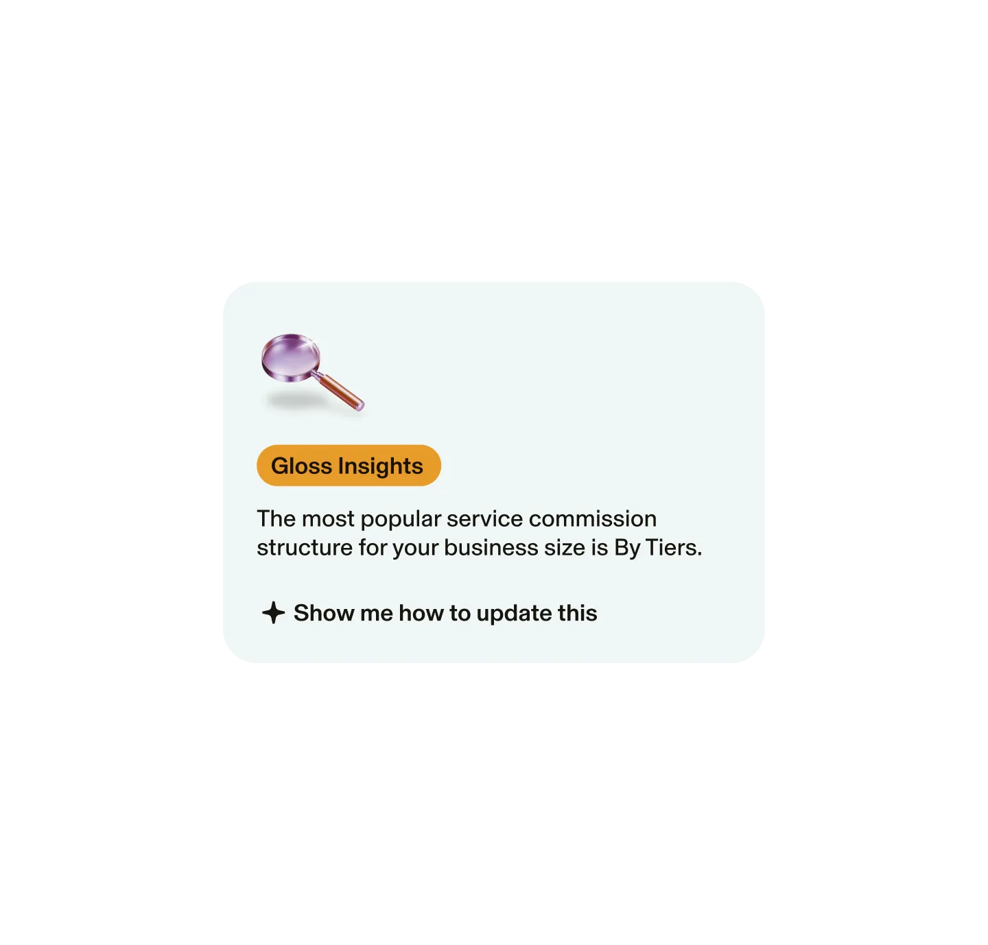 Not sure how to set up your commissions? Gloss Insights offers data-driven recommendations to optimize your commission structure, informed by trends from businesses like yours.