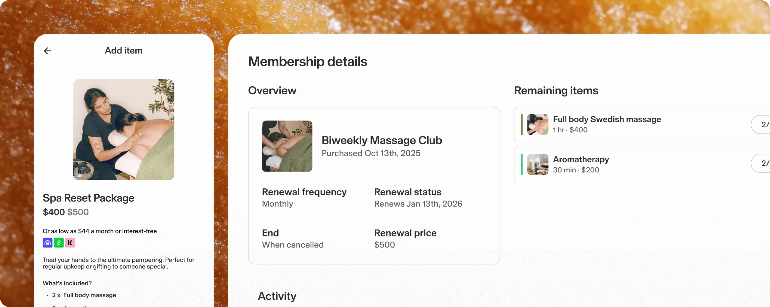 Sell prepaid packages and recurring memberships in person or online. Clients save on services, while you save time with automated redemptions and renewals.