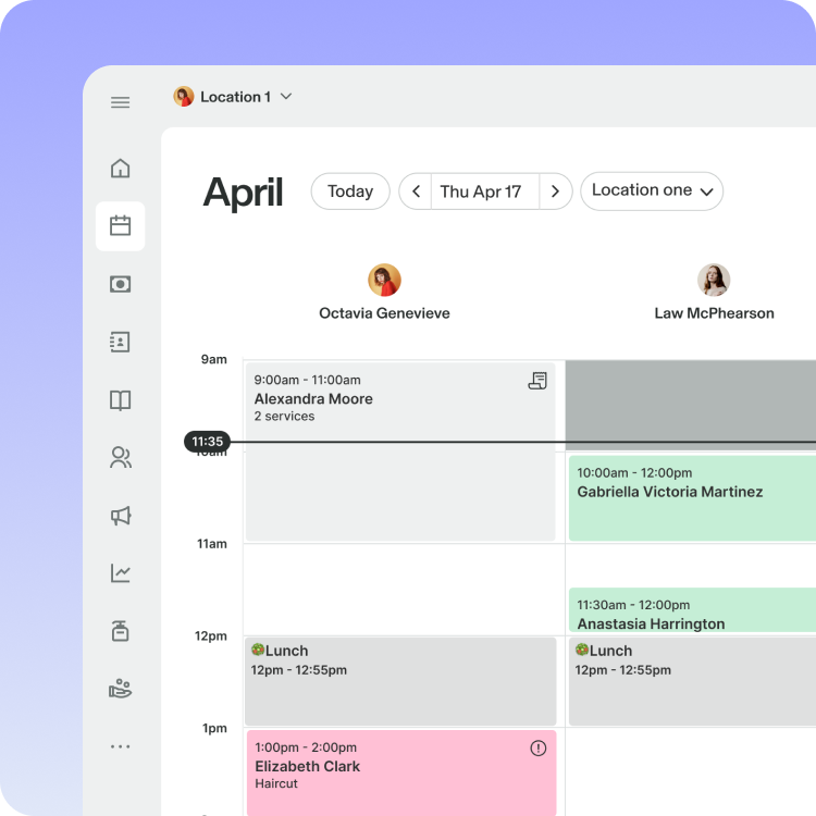 See your whole staff’s schedule or filter by member. With color-coding and clear appointment icons, GlossGenius’s staff management tools make it easy to spot availability, personal blocks, and working hours at a glance.